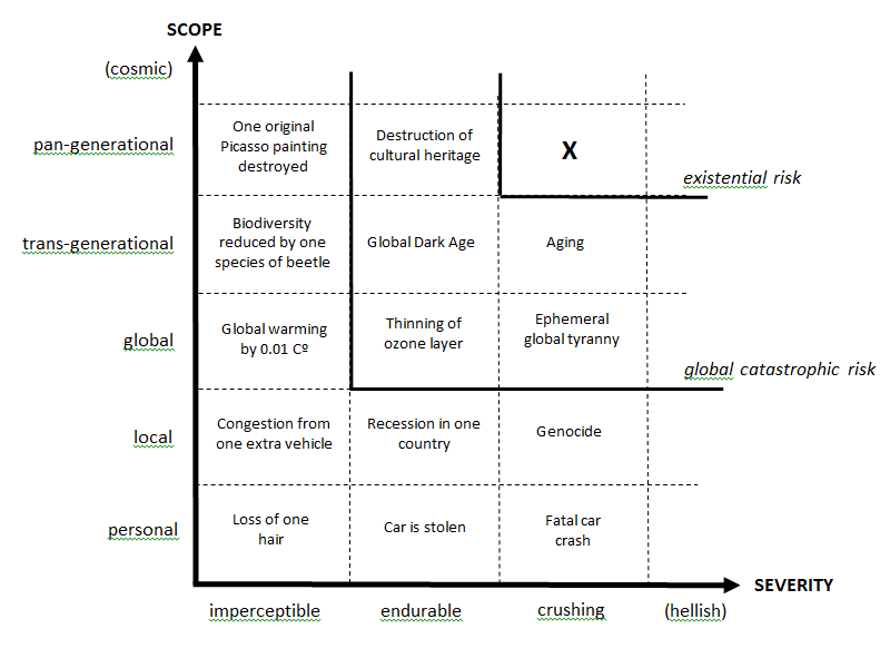 6 As indicated in the figure, the axes can be extended to encompass conceptually possible risks that are even more extreme. In particular, pan-generational risks can contain a subclass of risks so destructive that their realization would not only affect or pre-empt future human generations but would also destroy the potential of the part of the universe that lies in our future light cone to produce intelligent or self-aware beings (cosmic scope). Further, according to some theories of value there can be states of being that are much worse than nonexistence or death (e.g., horrible incurable diseases), so one could in principle extend the x-axis as well (hellish severity). We will not explore these conceptual possibilities in this paper.
