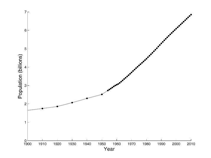 Figure 3: World population over the last century. Calamities such as the Spanish flu pandemic, the two world wars, and the Holocaust scarcely register. (If one stares hard at the graph, one can perhaps just barely make out a slight temporary reduction in the rate of growth of the world population during these events.)