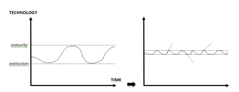 Figure 4: Collapse recurring indefinitely? The modern human condition represents a narrow range of the space of possibilities. The longer the time scale considered, the lower the probability that humanity's level of technological development will remain confined within the interval defined at the lower end by whatever technological capability is necessary for survival and at the upper end by technological maturity.