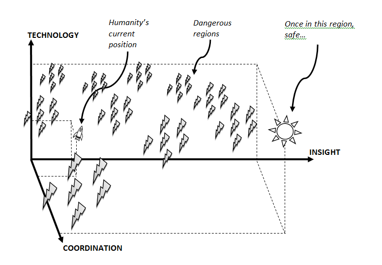 Figure 5: The challenge of finding a safe path. An ideal situation might be one in which we have a very high level of technology, excellent global coordination, and great insight into how our capabilities can be used. It does not follow that getting any amount of additional technology, coordination, or insight is always good for us. Perhaps it is essential that our growth along different dimensions hew to some particular scheme in order for our development to follow a trajectory through the state space that eventually reaches the desired region.